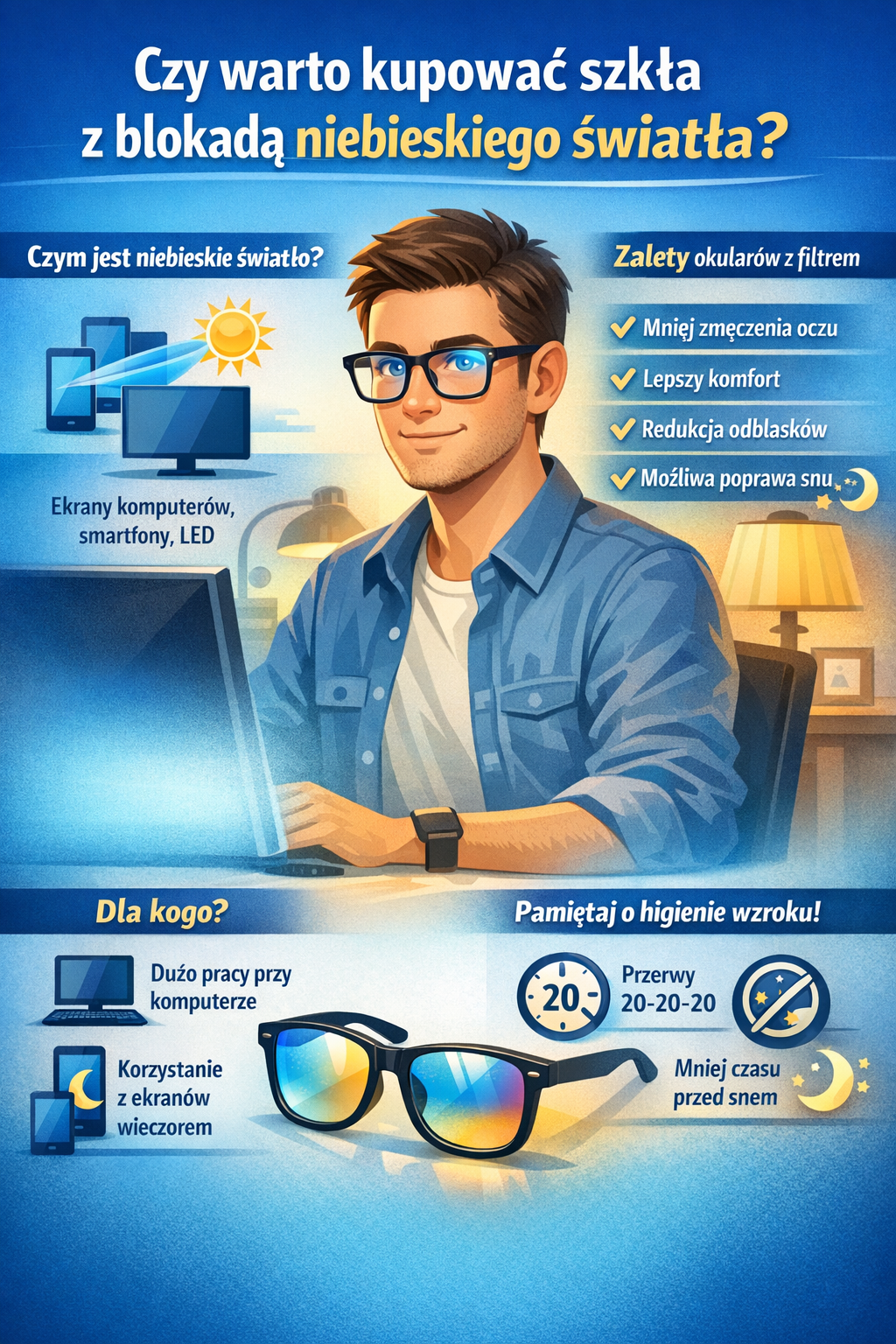 Okulary z blokadą niebieskiego światła mogą poprawić komfort pracy przy komputerze i ograniczyć zmęczenie oczu. Nie są jednak koniecznością dla każdego użytkownika. W wielu przypadkach ich działanie jest raczej wsparciem dla codziennej higieny wzroku niż podstawową metodą ochrony oczu.